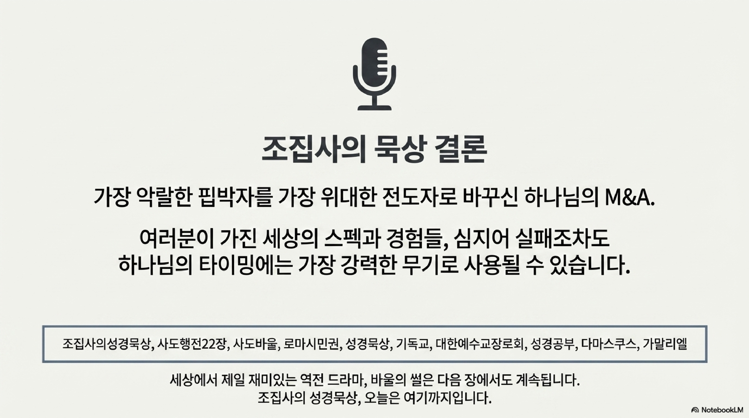 조집사의 성경묵상은(는) 다음 시간에도 뼈 때리는 통찰과 함께 다시 돌아오겠습니다.