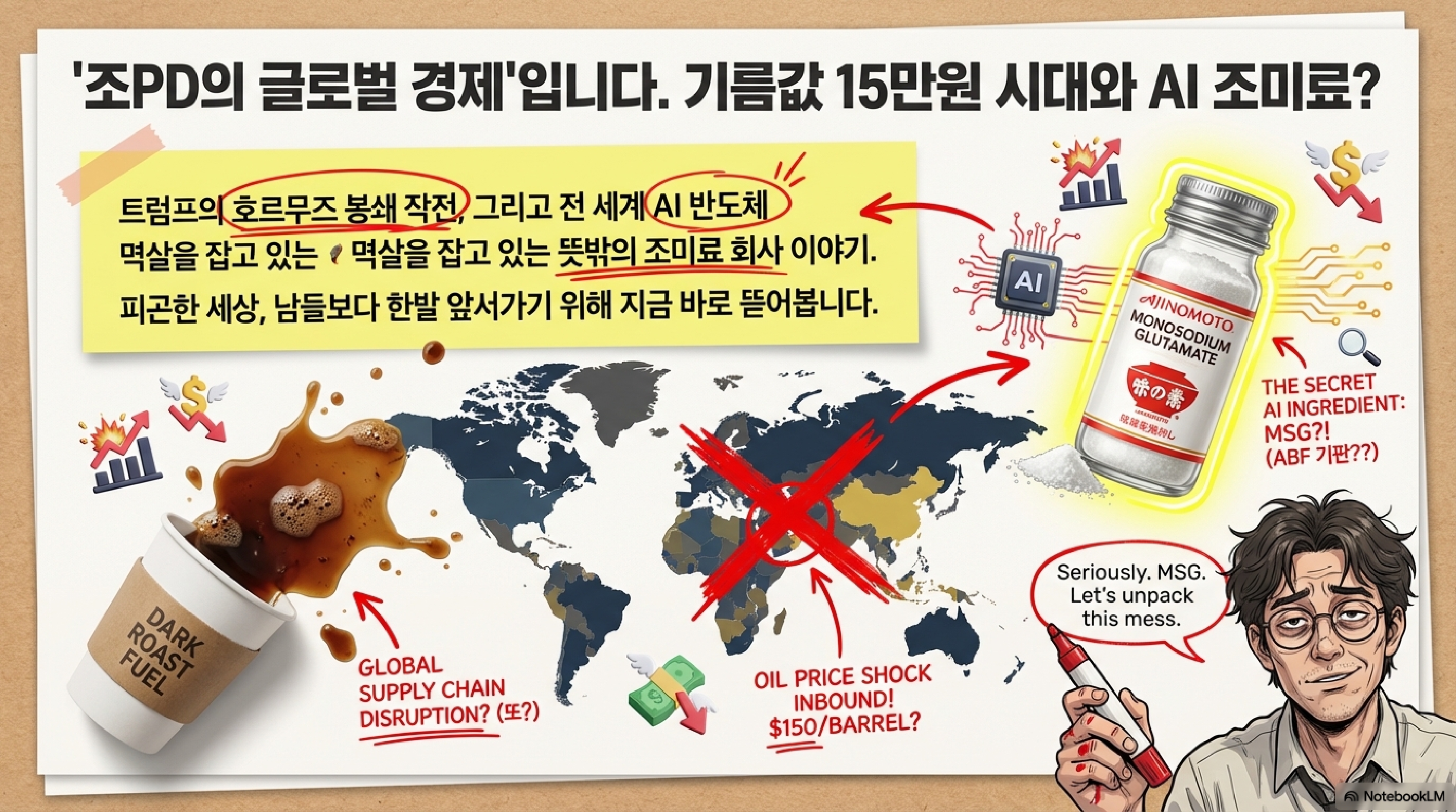 수백조 원을 쏟아부어서 아주 최첨단 우주선을 야심차게 만들었는데, 막상 발사하려고 보니까 우주선 문을 닫을 작은 나사 하나가 없어서 멈춰선 상황을 상상해 보신 적 있습니까? 지금 전 세계를 뒤흔들고 있는 AI 혁명의 이면에는 이처럼 황당하고도 치명적인 병목 현상들이 도사리고 있습니다. 조미료 회사에 목줄이 잡힌 반도체 시장부터, 중동의 위기가 불러온 스니크플레이션, 그리고 그 절망감 속에서 탄생한 기괴한 예측 시장까지. 우리가 몰랐던 글로벌 경제의 서늘한 민낯을 조명합니다.