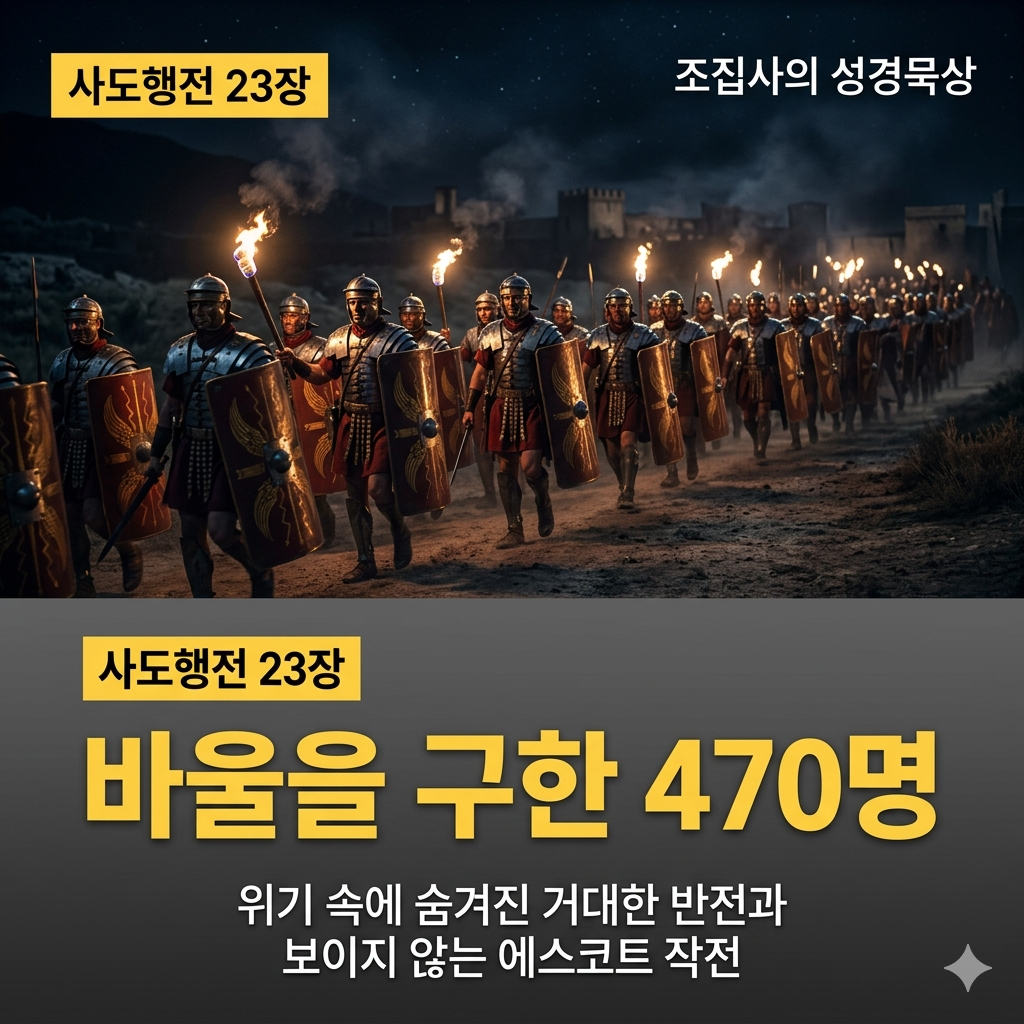 바울을 죽이려는 자들의 분노와, 살리려는 듯 보이지만 사실은 자신의 출세를 도모했던 천부장의 치졸함. 이 역설적인 상황이 결국 바울을 가장 안전하게 지키는 방패가 되었습니다. 인생의 꽉 막힌 벽 앞에서도 절망하지 않아야 할 이유가 여기에 있습니다.