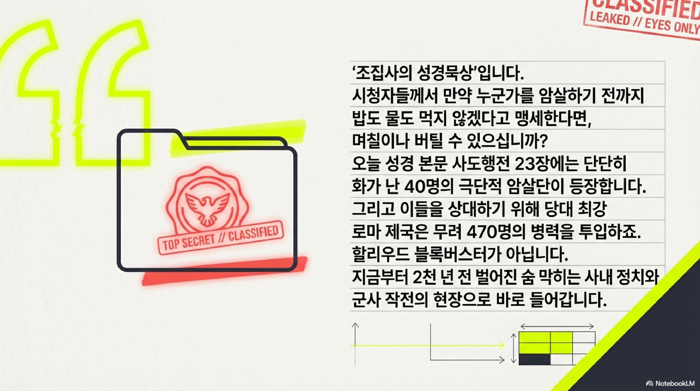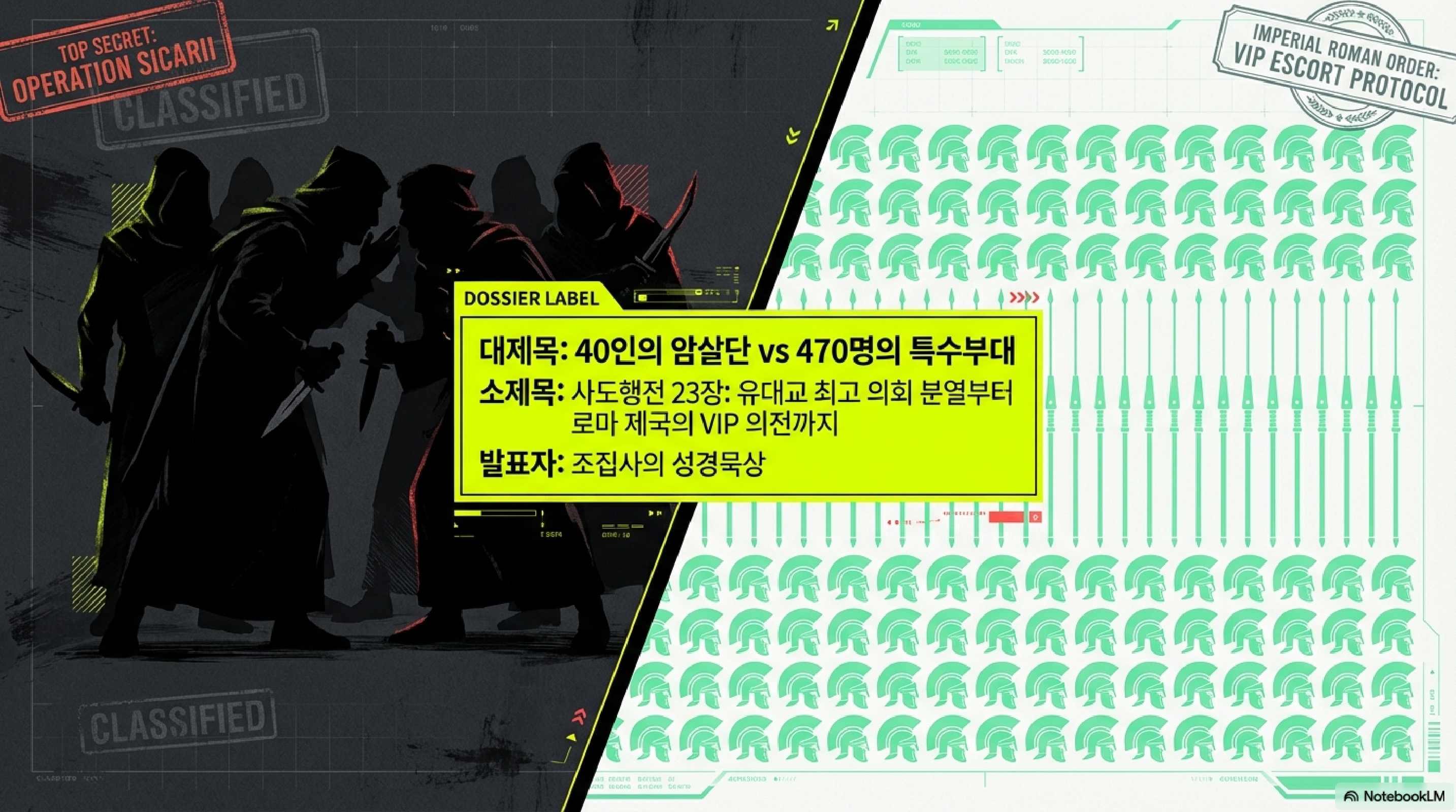 단 한 명의 죄수를 호송하기 위해 로마 정규군 470명이 투입된 전대미문의 사건이 있습니다. 종교 권력의 맹목적인 분노와 피비린내 나는 암살단의 위협, 그리고 부패한 관료의 이기심이 뒤엉킨 성경의 기록은 단순한 옛이야기를 넘어 2000년 전 유대와 로마 사회의 치열한 정치적 민낯을 적나라하게 보여줍니다. 살벌한 스파이전과 고도의 심리전이 오가는 역사의 현장 속으로 직접 들어가 보겠습니다.