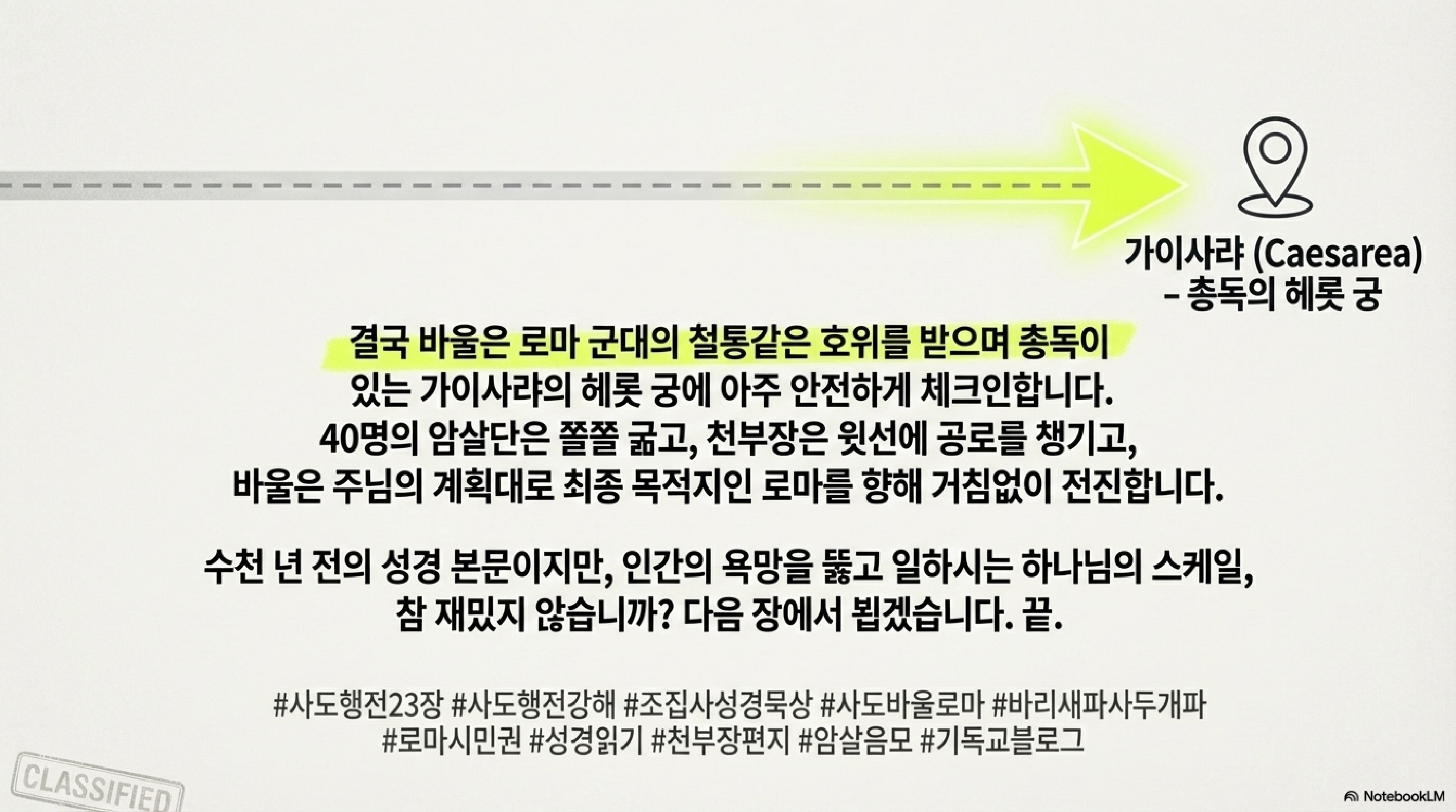 - 자신의 공적을 부풀리기 위해 쓴 천부장의 보고서가 결국 바울의 완벽한 무죄 증명서로 변모합니다.