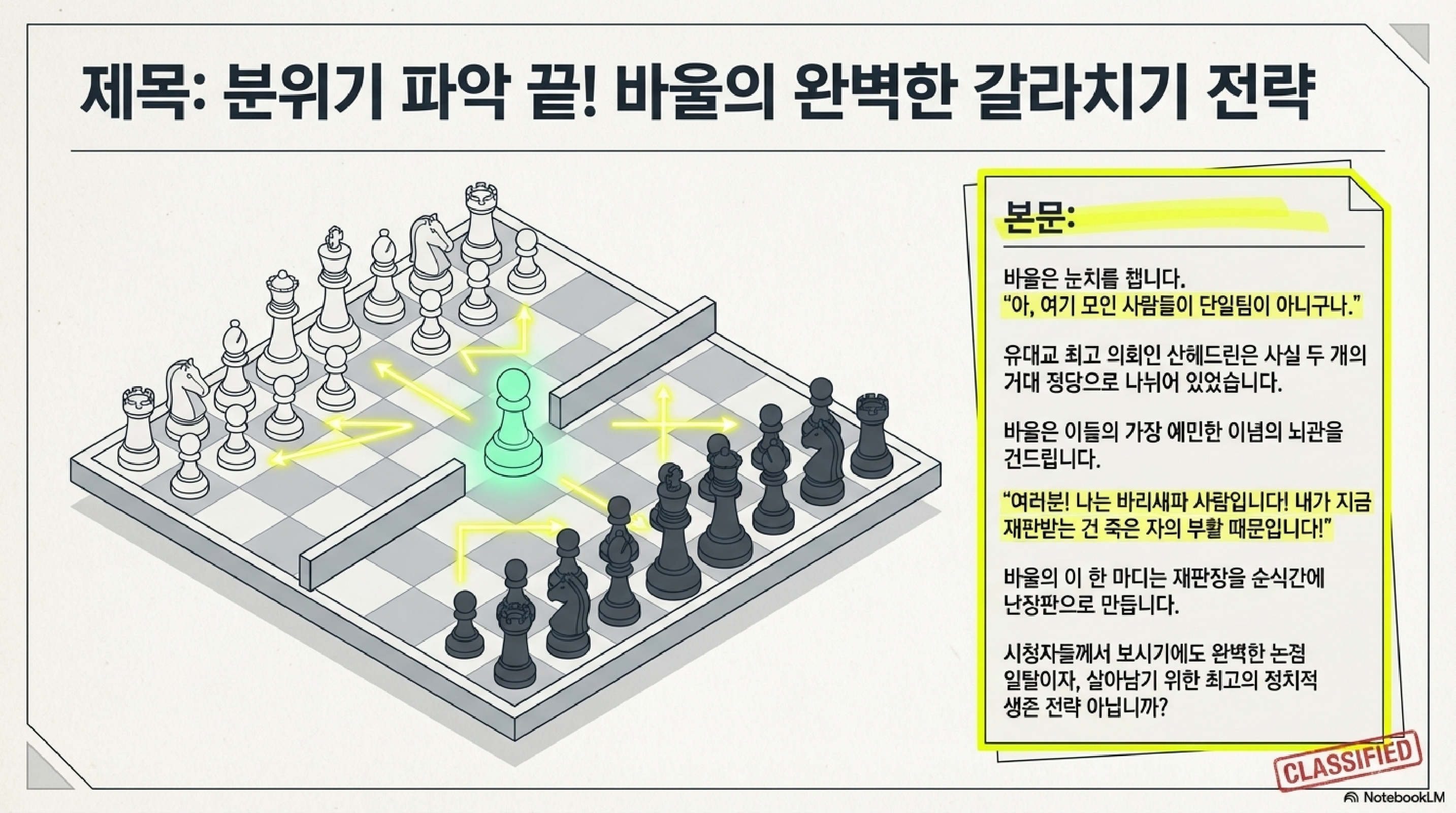 - 부패한 대제사장 앞에서도 흔들리지 않고 법리적 대응과 갈라치기 전술을 구사한 바울의 천재적 심리전을 분석합니다.