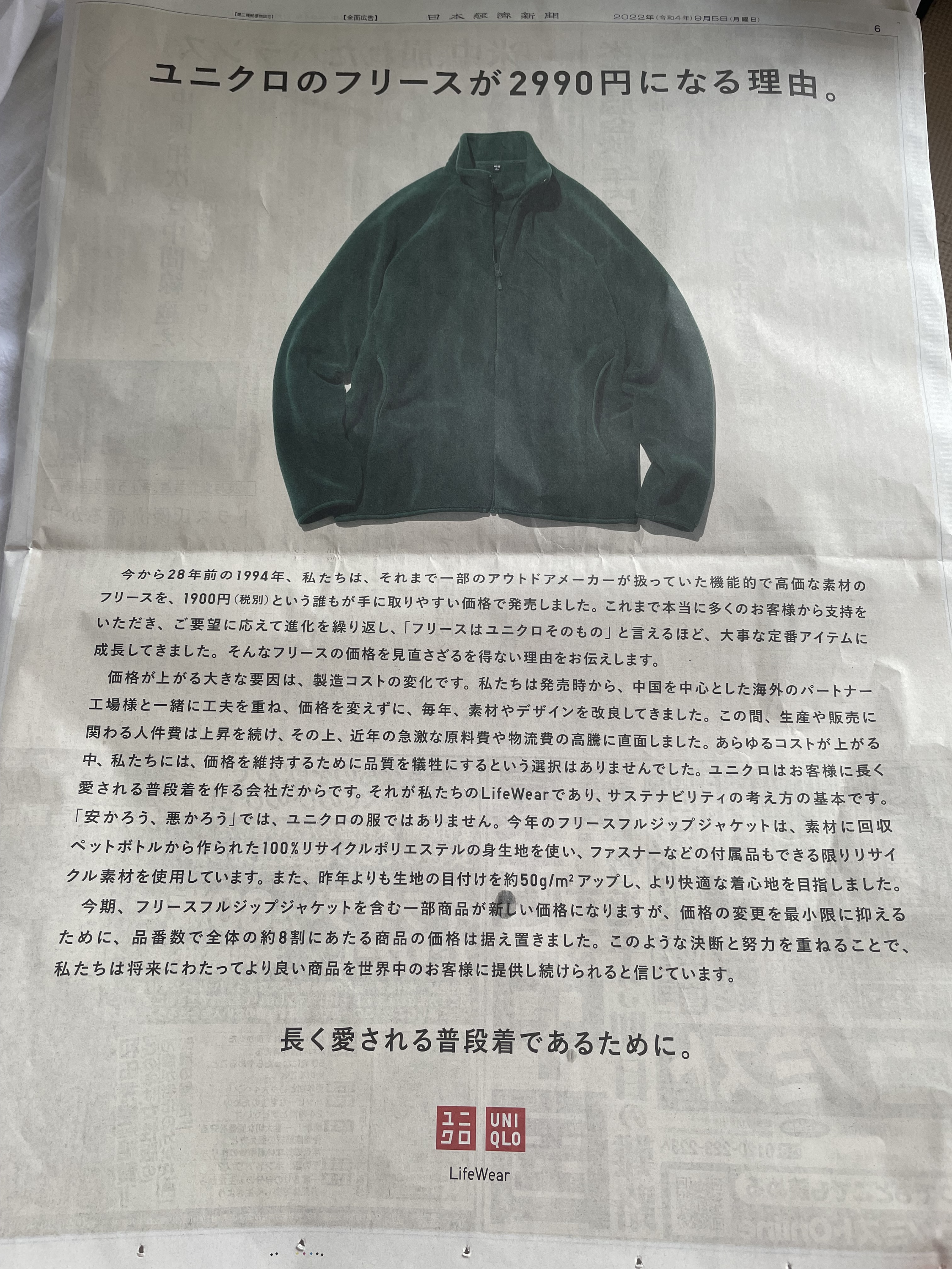 지금부터 28년전 1994년, 후리스를 1,900엔에 판매해서, [후리스는 유니클로 그 자체] 라고 불릴 정도로 중요한 아니템으로 성장해왔는데, 가격을 올리는 이유를 전달하겠다는 내용이다.