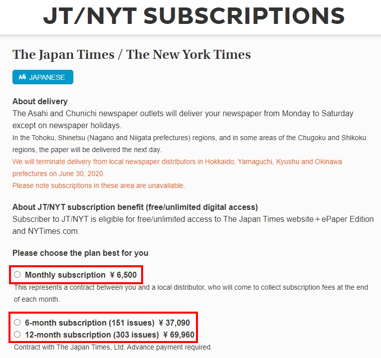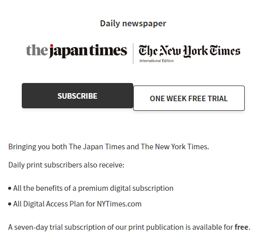 Daily newspaper Bringing you both The Japan Times and The New York Times. Daily print subscribers also receive: All the benefits of a premium digital subscription All Digital Access Plan for NYTimes.com A seven-day trial subscription of our print publicati