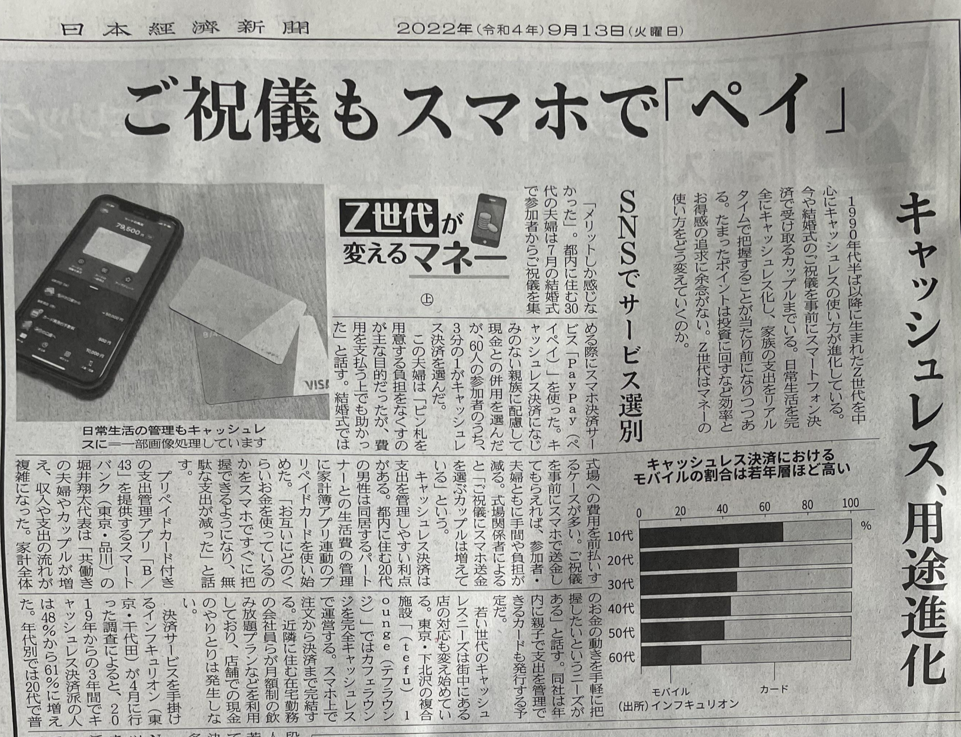 일본도 90년대 후반 이후에 태어난 Z세대들은 캐쉬리스 Cashless에 익숙해져, 스마트폰 결제나 축의금도 페이로 송금하는 것에 익숙하다는 기사.