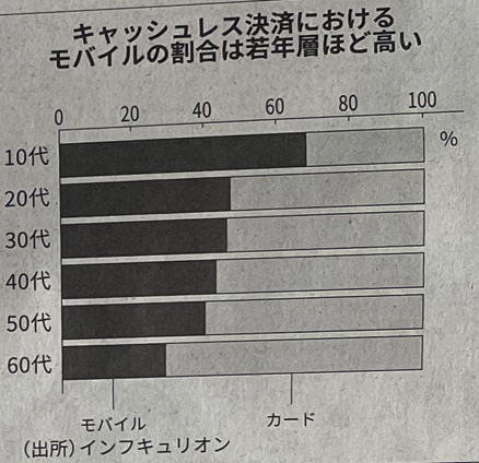 캐쉬리스결제에 있어서 모바일 결제 비율은 젊을수록 높아진다는 내용