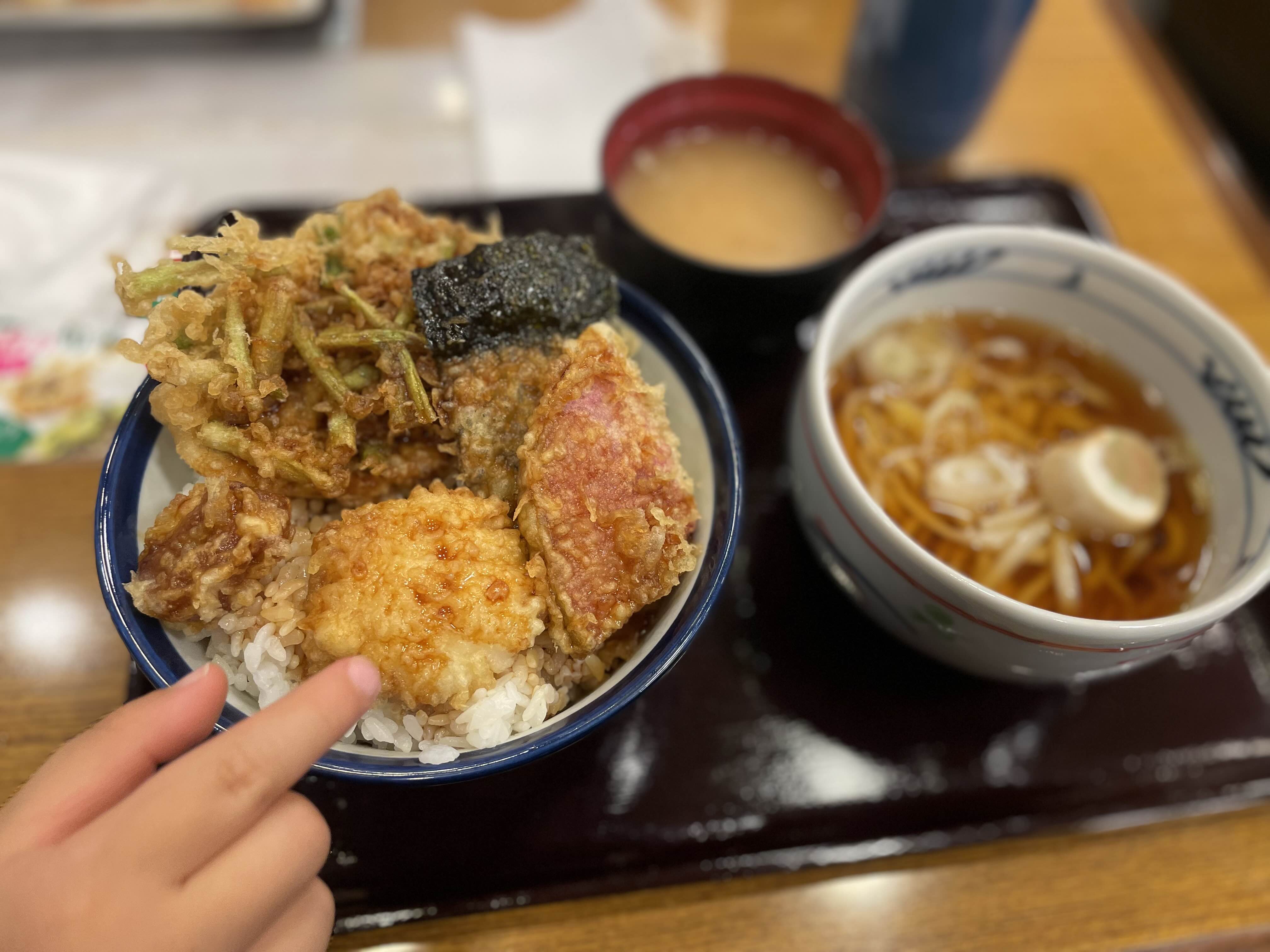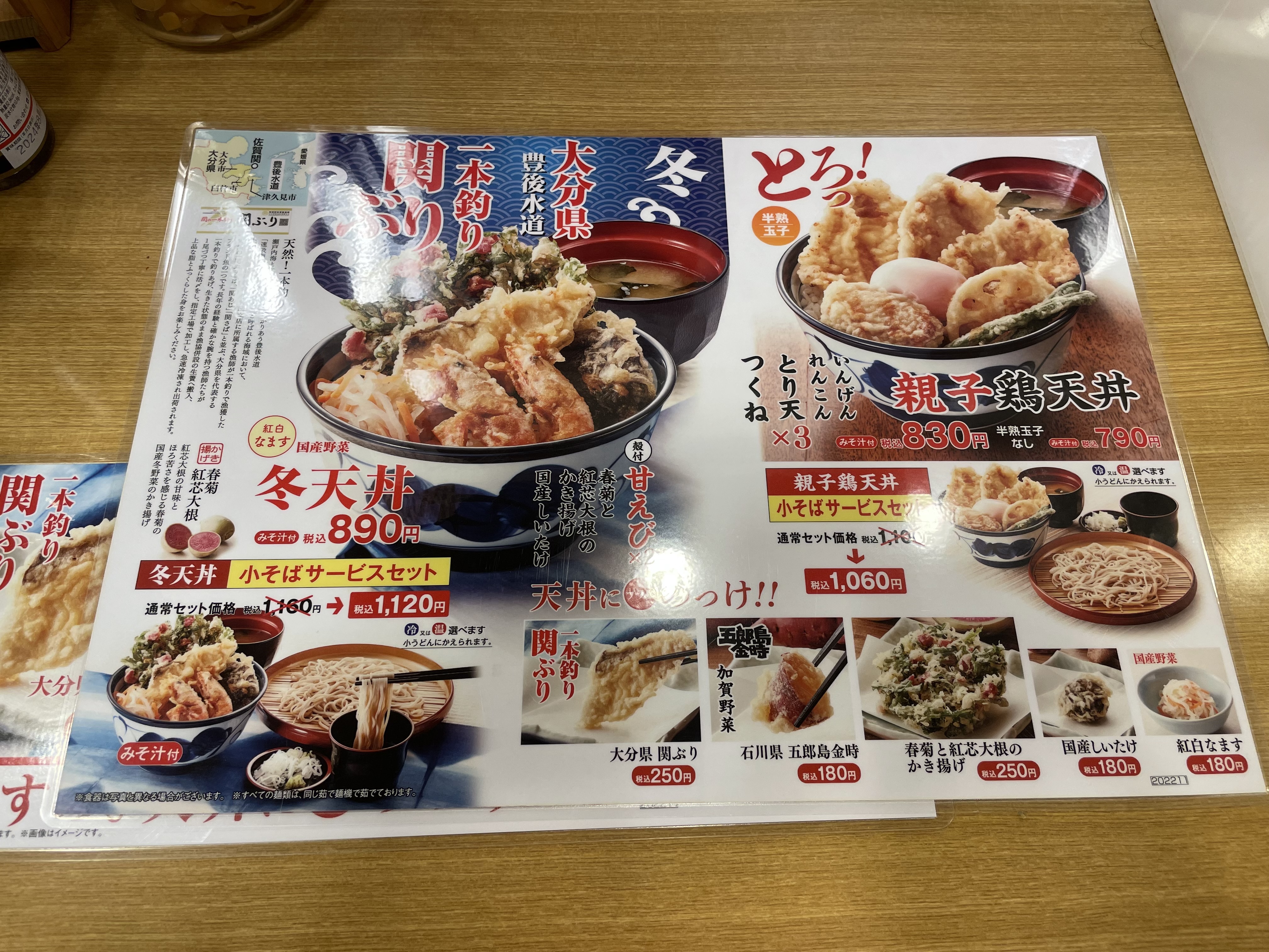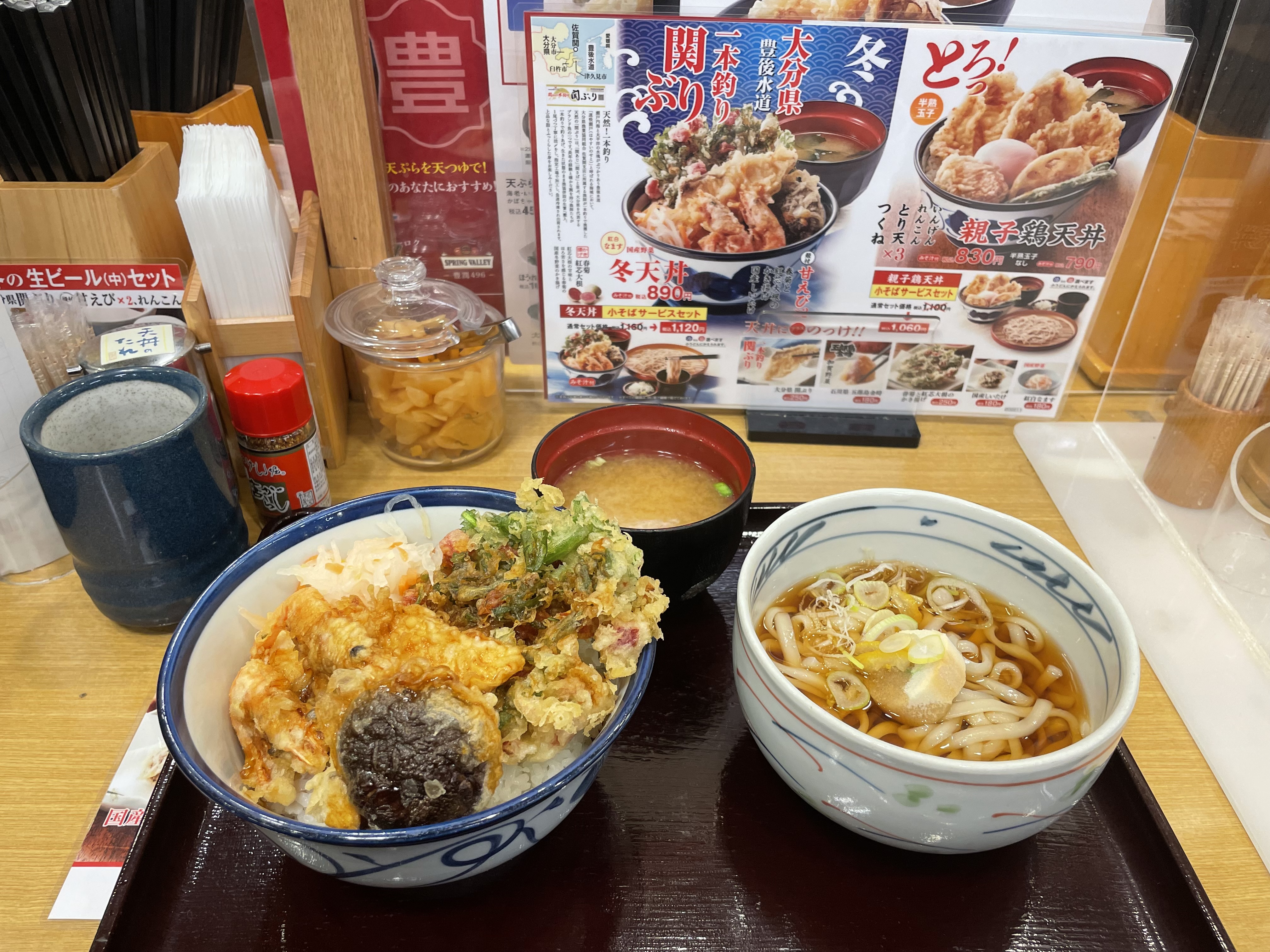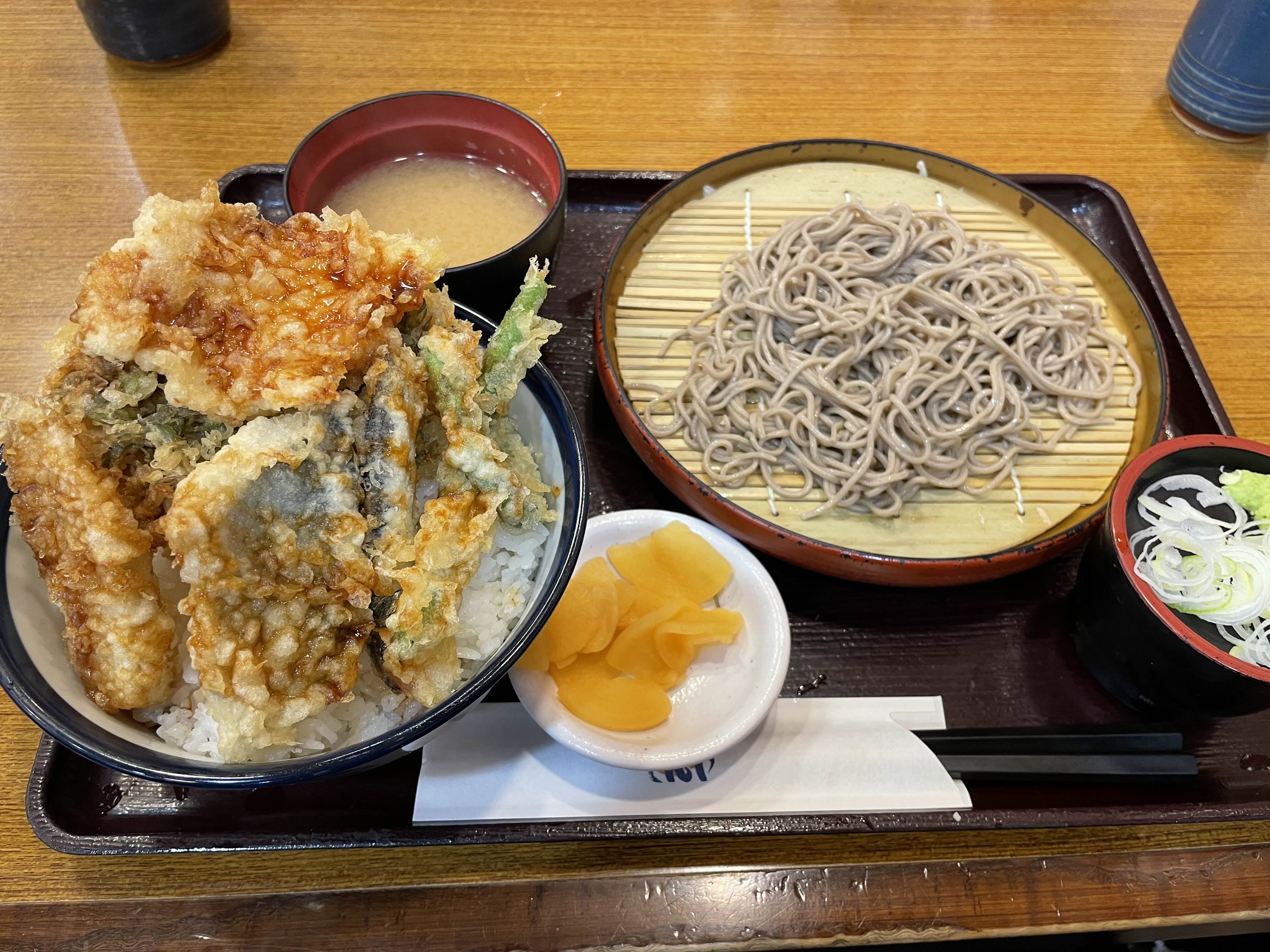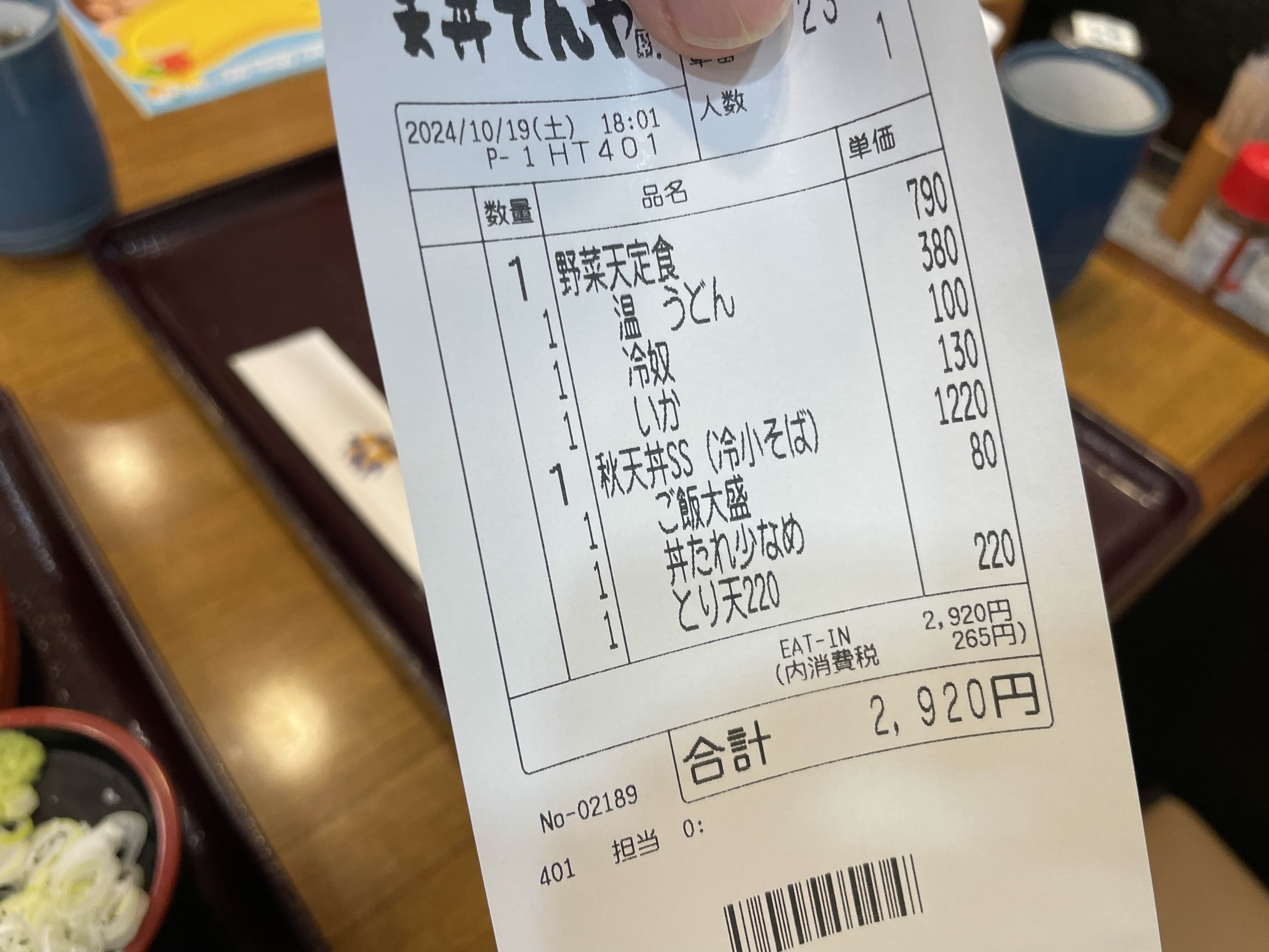 나는 가을 텐동 + 냉소바 1,220엔 + 오오모리 80엔 + 닭튀김 220엔
