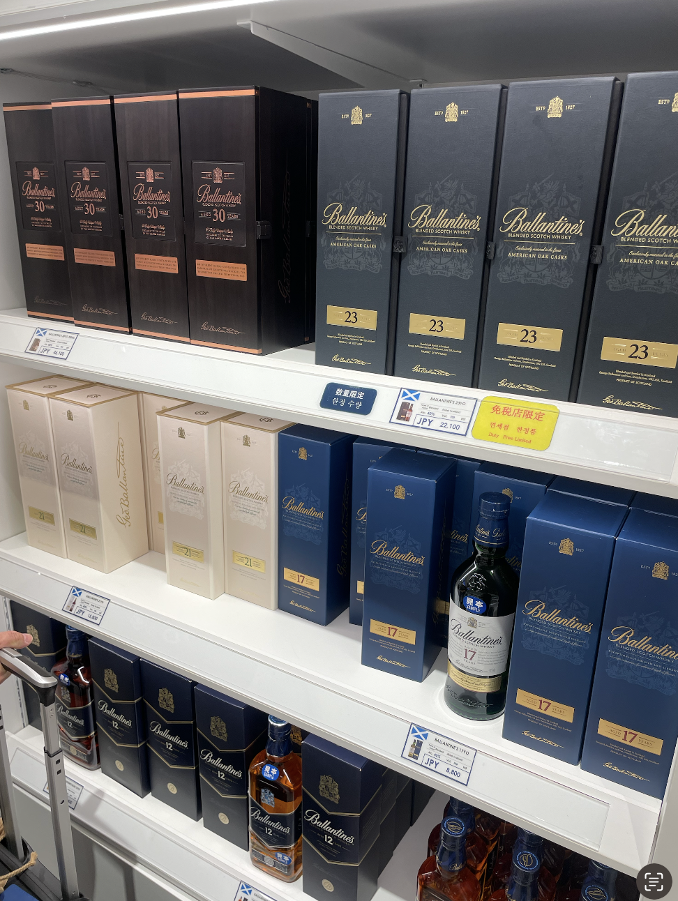 하네다는 아래 참고.. 일본 하네다 공항 면세점 닷사이 쿠보타 발렌타인 위스키 주류 가격 2022년 11월 닷사이 23 5,600엔 닷사이 39 2,600엔 쿠보타 만주 3,900엔 쿠보타 센주 1,300엔 발렌타인 30년 46,100