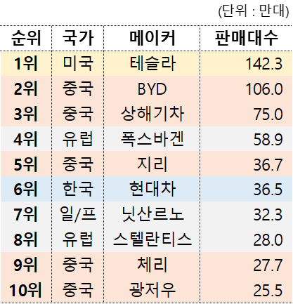 테슬라가 압도적이지만 결국 중국 차들을 합산하면 중국이 압도하는 모양새