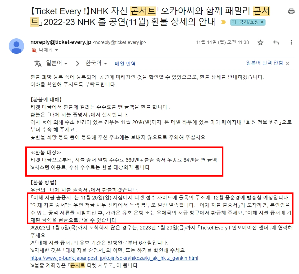 요는.. 콘서트 안온게 확인이 되니.. 우체국 전신환으로 환불을 해주겠다는 내용.. ㅎ ㅏ..
