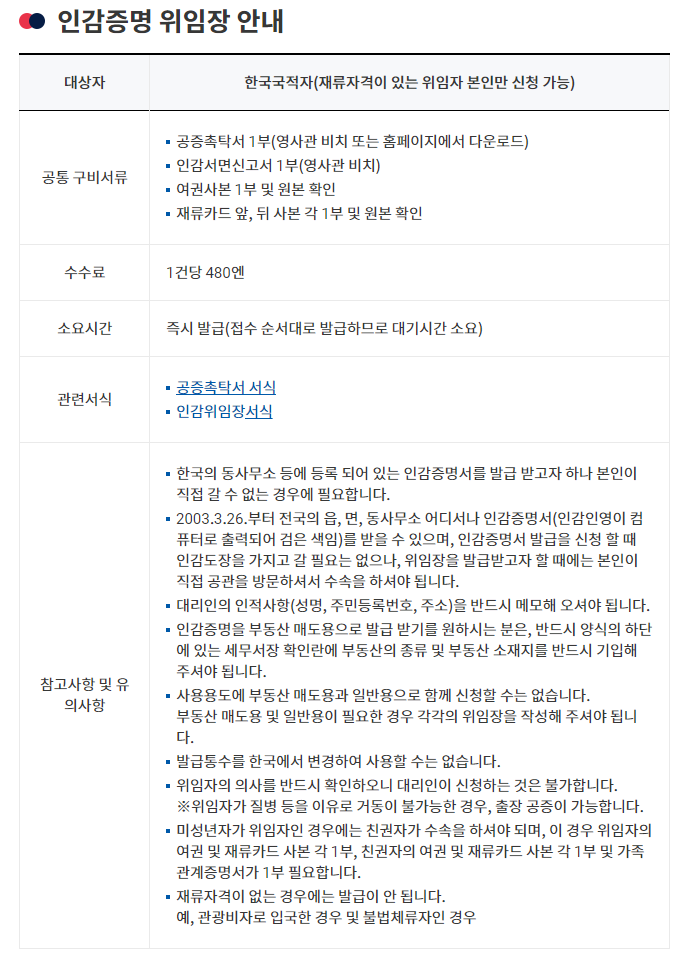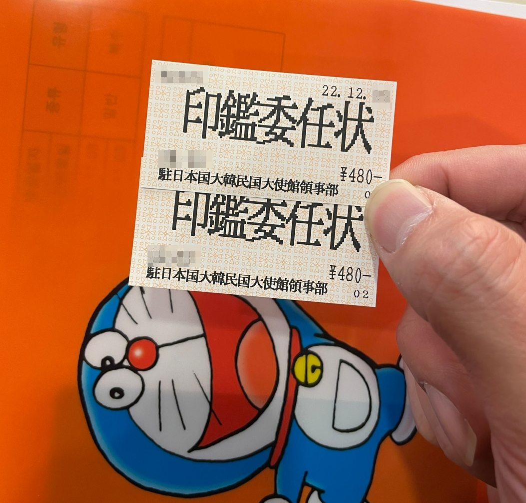 - 수입인지 33번(일반위임장) 240엔 1장, 34번(인감위임장) 480엔 2장