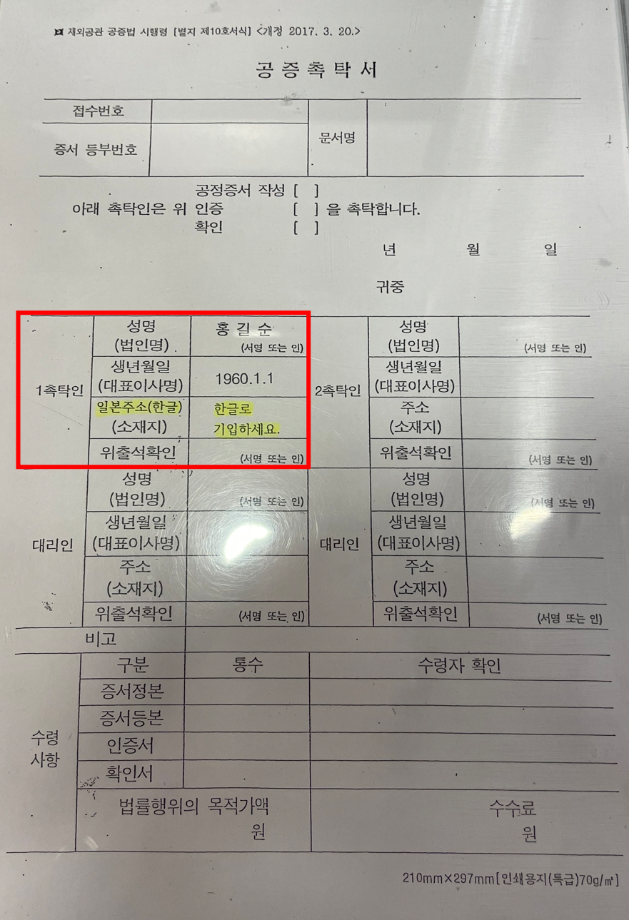 공증촉탁서는 아래 3개만 기재하면 된다.