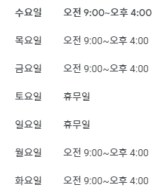 토일은 휴무일이고, 오전 9시부터 오후 4시까지