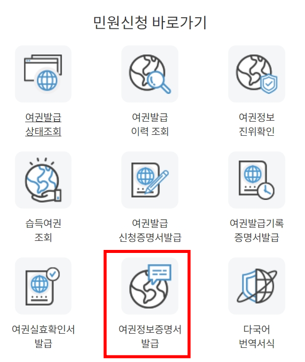 - 여권 (주민번호 미기재시 여권정보증명서 온라인 발급)