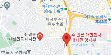주 일본 대한민국 대사관 영사부 · 〒106-0047 Tokyo, Minato City, Minamiazabu, 1 Chome−7−32 朝日南麻布マ