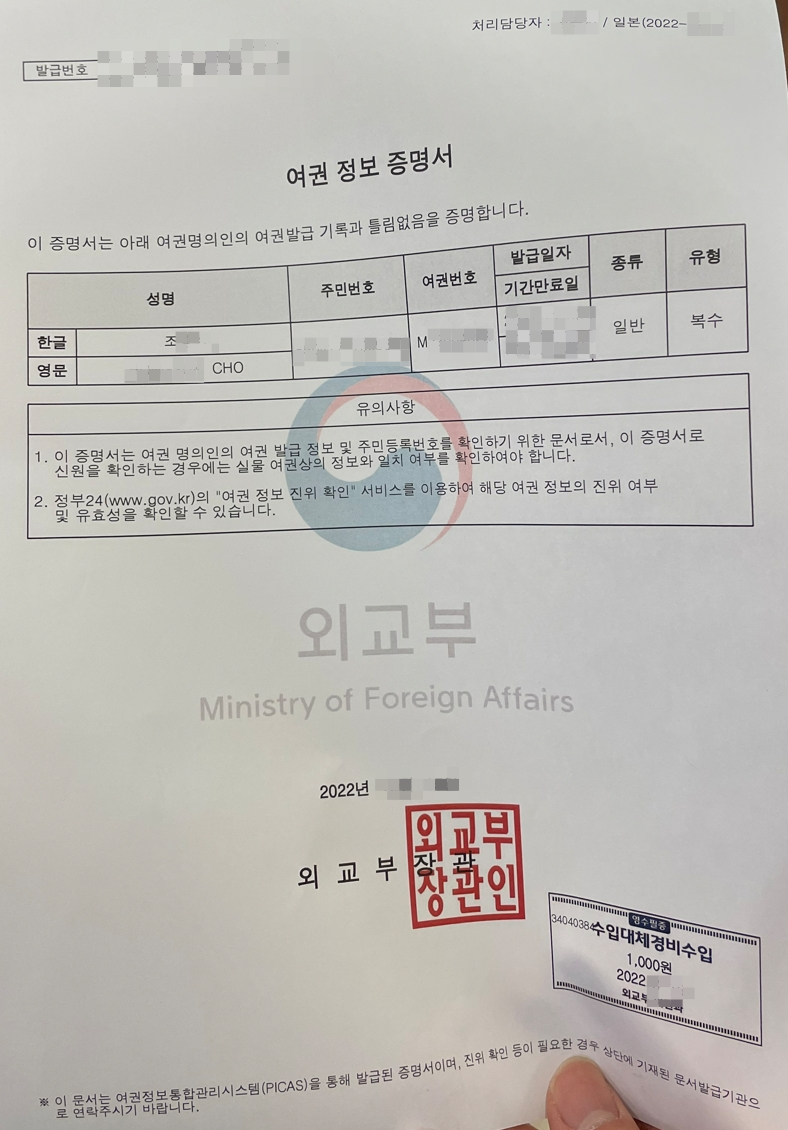 근데 문제가 여권에 주민등록번호가 기재가 되어있지 않아서 2층에서 여권정보 증명서를 발급받아야했다.