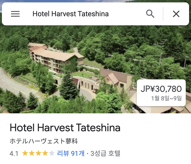 그 중 연말에 예약이 가능한 곳이 있어서, 호텔 하베스트 타테시나에 왔다.