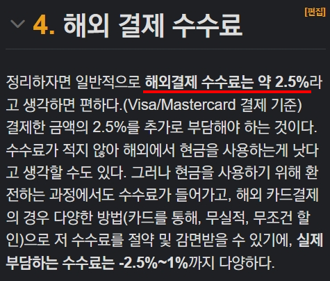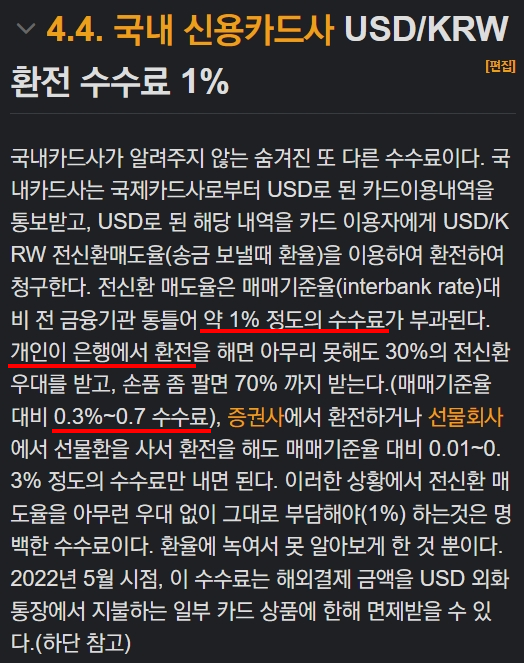 나무위키에서는 약 2.5%라고 하지만 실질적으로는 2.2% 혜택만 있어도 실제로 환전해서 결제하는 것과 큰 차이가 없다