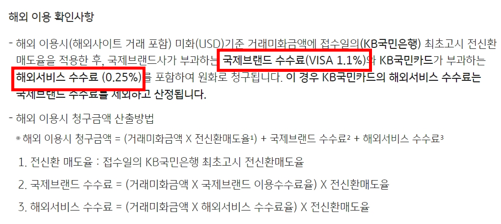 국제브랜드 VISA 1.1% + 해외서비스 수수료 0.25% 를 추가하면, 총 1.35%