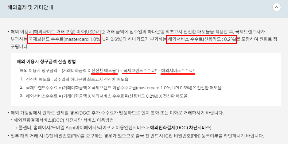 하나카드는 해외결제 1.2% 수수료 부과 (마스터 1% + 하나카드 0.2%)