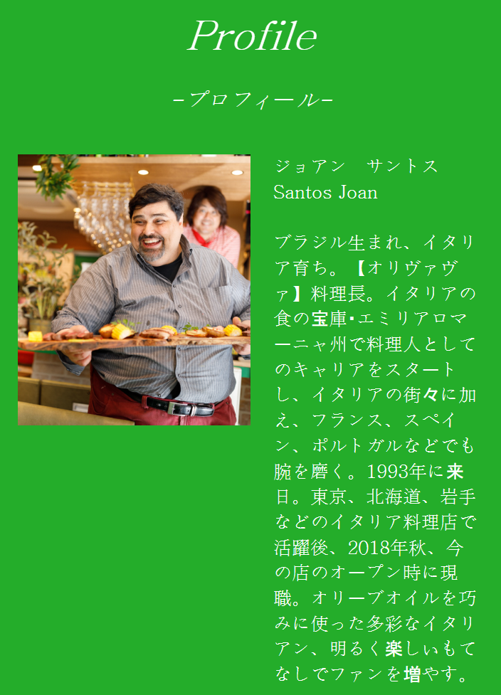 ジョアン サントス Santos Joan ブラジル生まれ、イタリア育ち。【オリヴァヴァ】料理長。イタリアの食の宝庫・エミリアロマーニャ州で料理人としてのキャリアをスタートし、イタリアの街