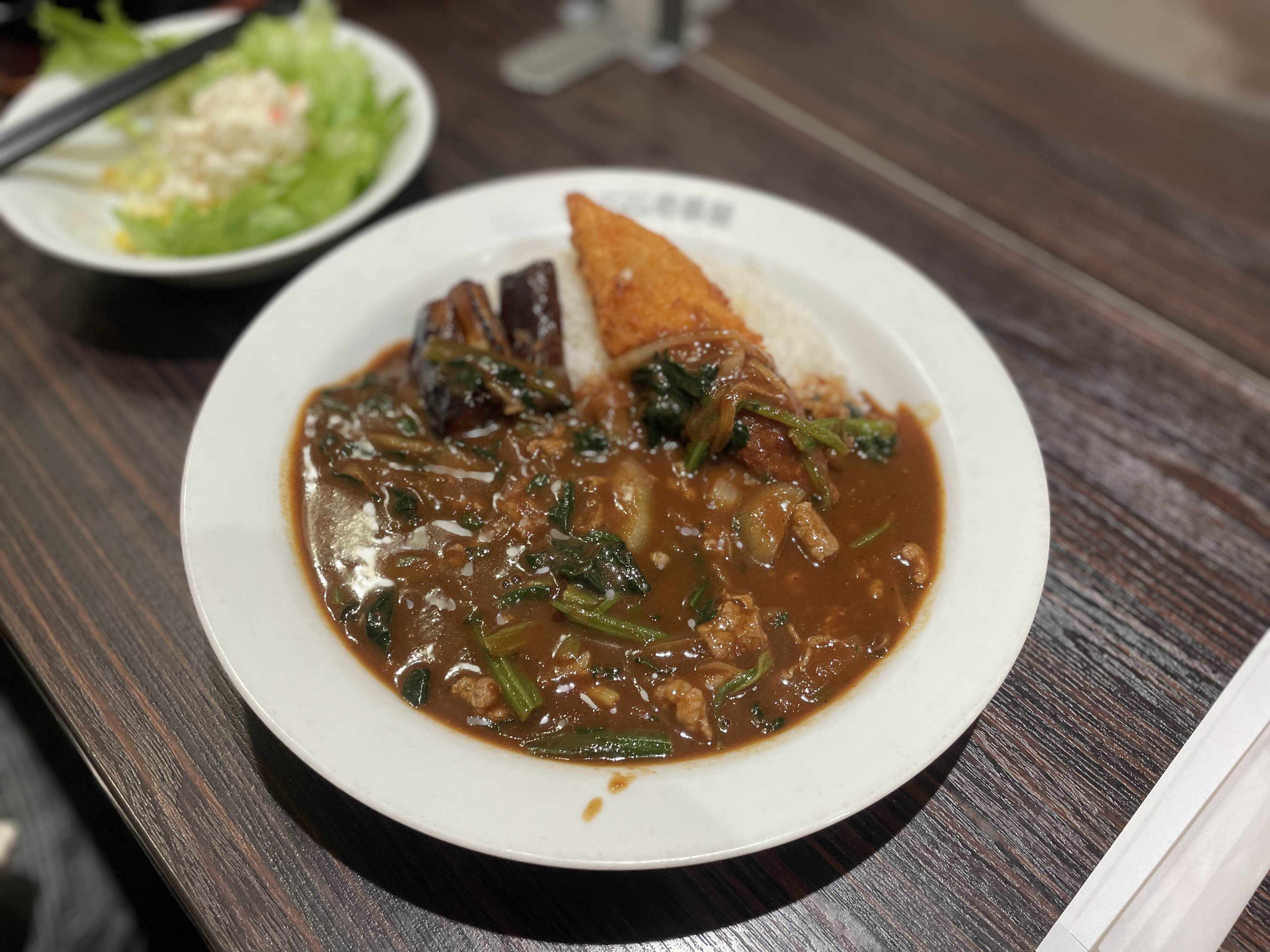 사모님의 시금치 하이라이스에 하프가지와 하프생선튀김 추가 카레 (1,076엔)