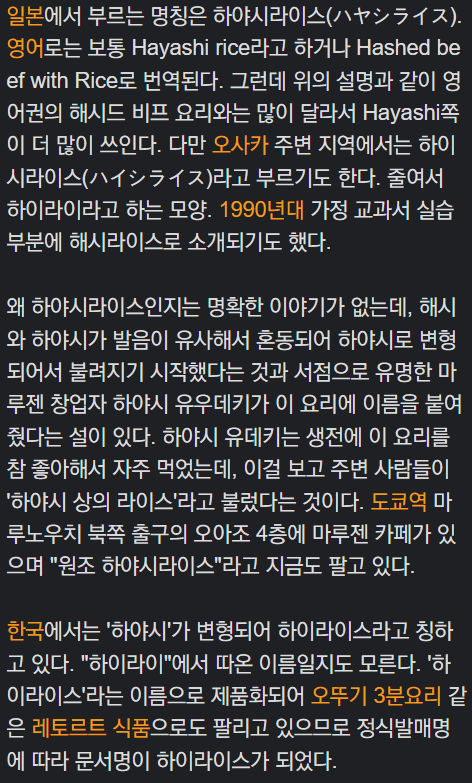 한국에서는 하야시가 변형되어 하이라이스라고 되었다고 한다. ㅎ ㄷ ㄷ