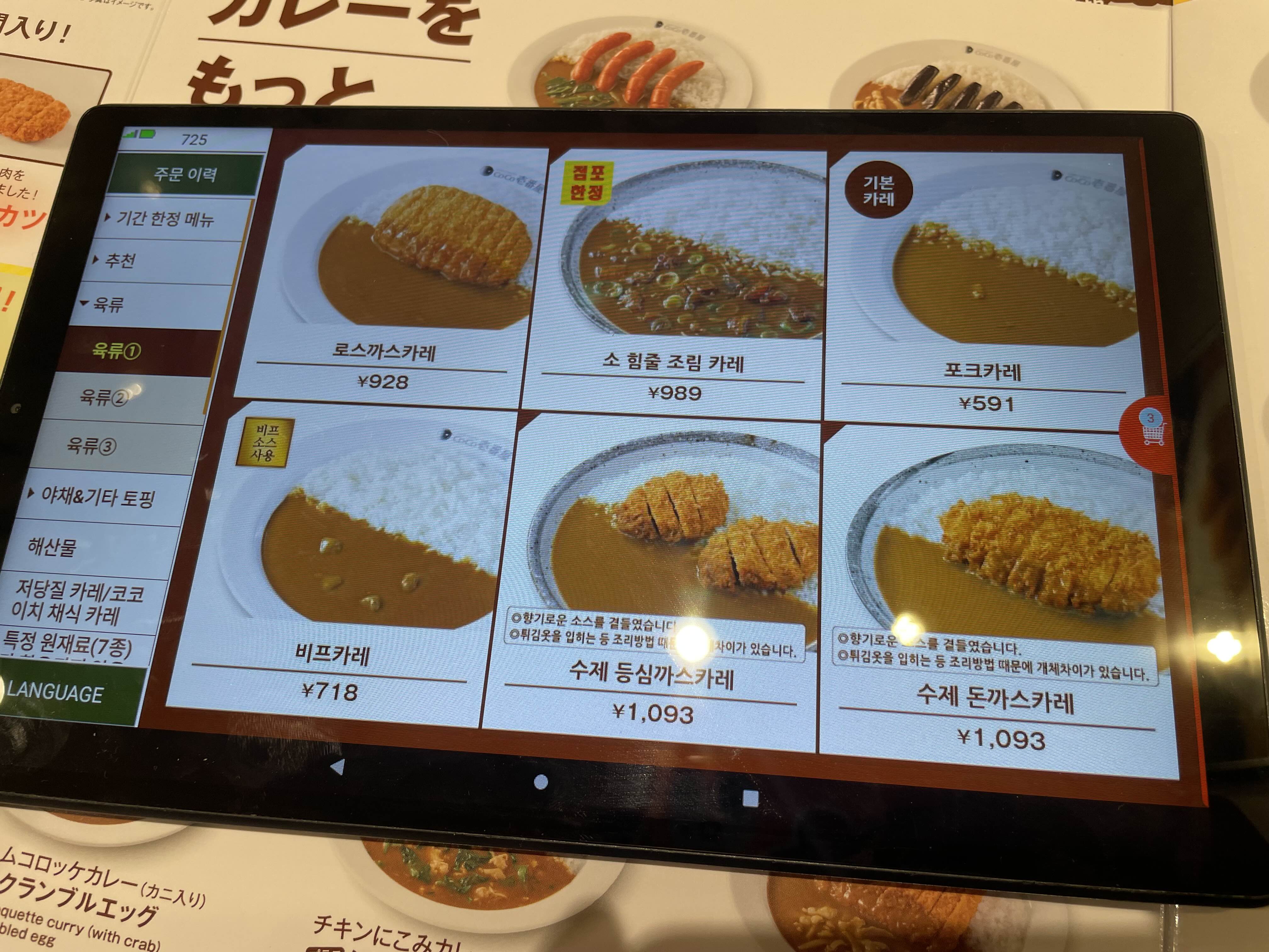 우선 베이스카레는 포크 / 단맛 포크 / 비프 / 베지 / 해시드비프(하이라이스) 등으로 선택할 수 있다.