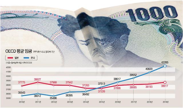 2019년 OECD 가 집계한 평균 임금도 한국이 일본보다 앞섰던 것을 볼 수 있다.