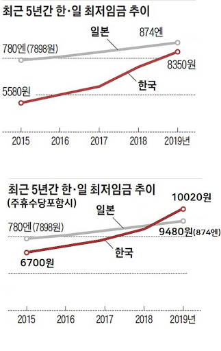 주휴수당까지 포함하면 2019년 한국의 최저임금이 이미 일본을 넘어섰다.