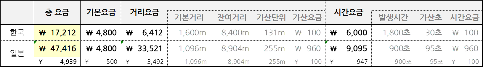 심야할증의 경우 한국도 가격이 많이 올랐지만 그래도 일본의 절반보다 낮다