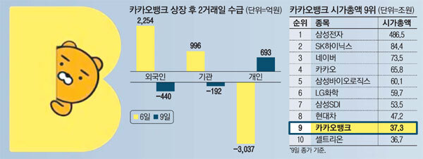 카카오뱅크는 상장 이틀차에 시총 9위를 달성했다.