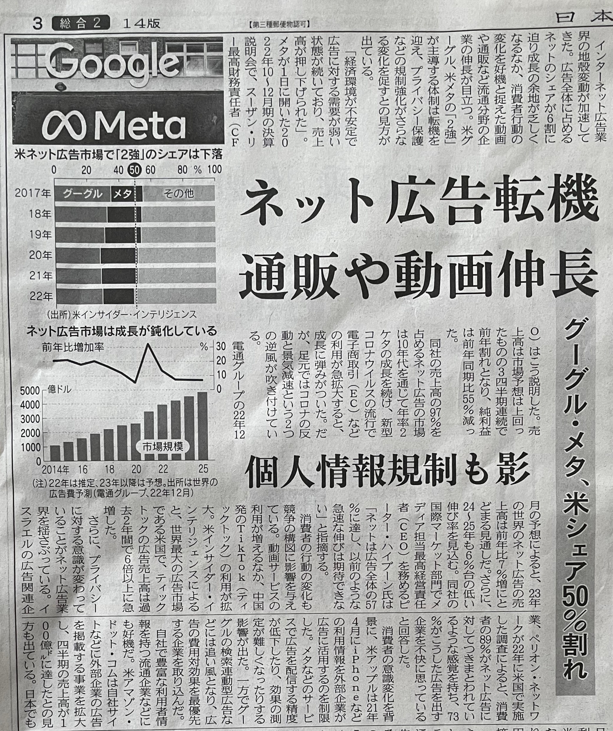 같은 해에 과거 최고의 54.7%에 달하는 '2사 과점'이라고 불리었던 구글과 메타의 점유율은 22년 48%까지 하락.