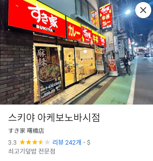 구글 평점 3.3점… ㅋㅋ 松屋 曙橋店 · 〒162-0065 東京都新宿区住吉町1−17 ジェントリー市ヶ谷 1F ★★★☆☆ · 牛丼屋 maps.google.com 타베로그 3.03점… ㅋㅋ 이런걸 글을 적고 있으면 자괴감으