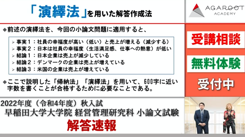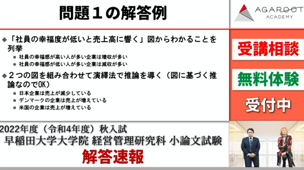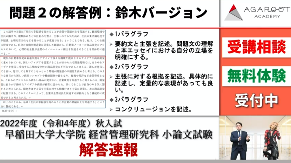 2022年10月23日に行われました早稲田大学大学院 経営管理研究科(早稲田大学ビジネススクール/WBS)の2023年度秋入試における筆記試験・小論文(過去問)についての解説をご紹介させていた