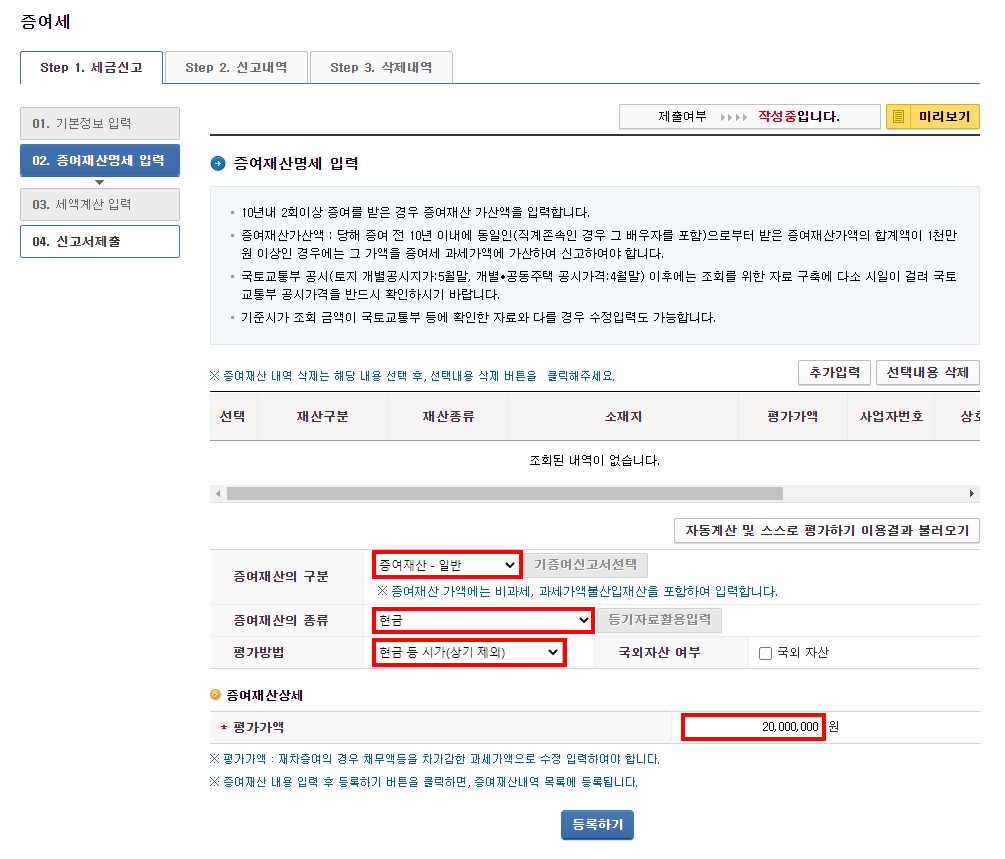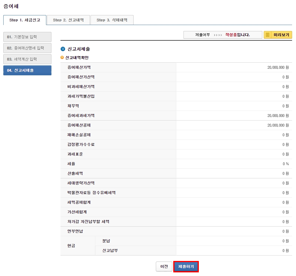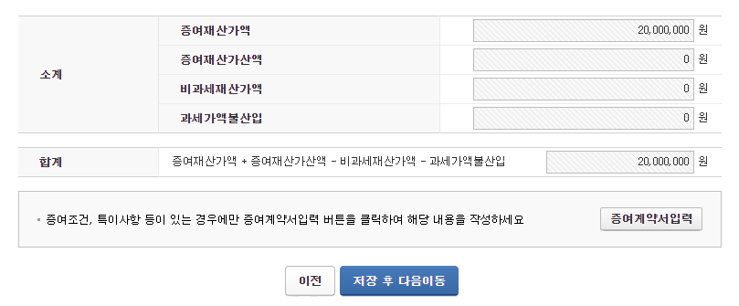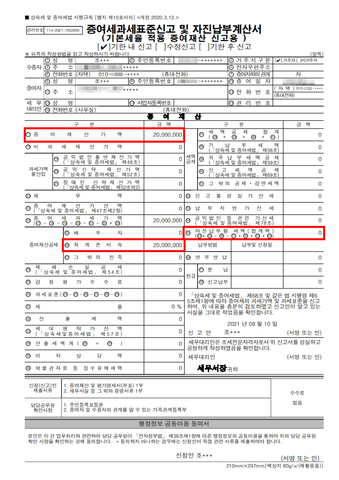 신고서를 보면 정상적으로 20,000,000원 증여 후 재산공제까지 받아 납부세액 0원으로 신고된 것을 볼 수 있다.