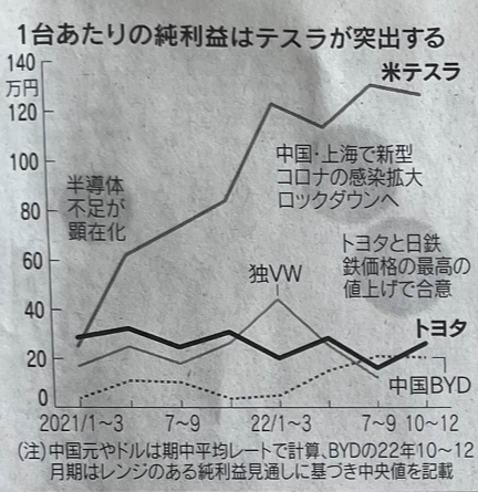 주요 부품을 사전에 관여하는 수직통합의 효과를 생산에 늘려, 22년의 EV판매는 186만대(플러그드인하이브리드포함)으로 전년비 3.1배로 늘어난 것으로 수익성의 존재감을 나타내고 있다.