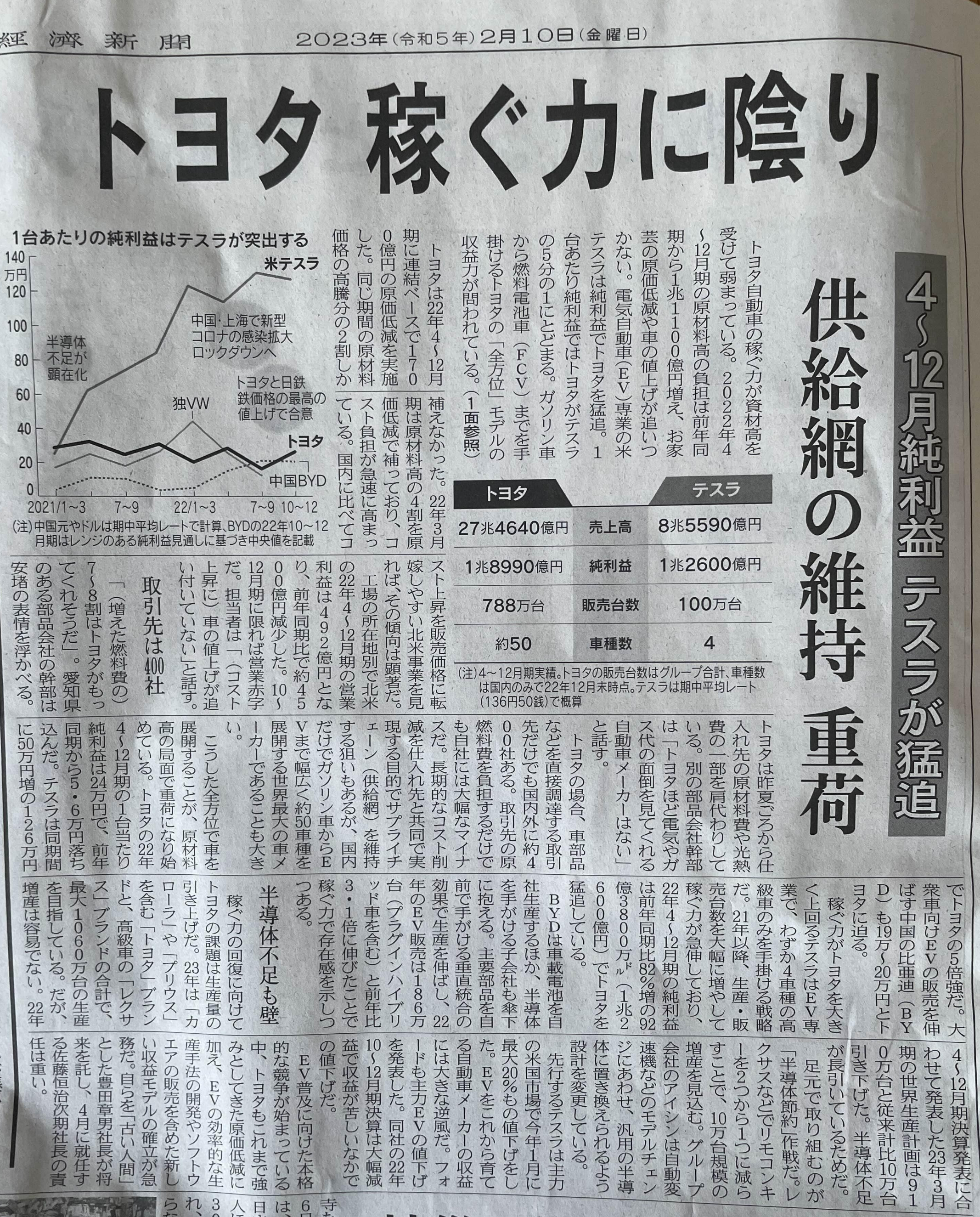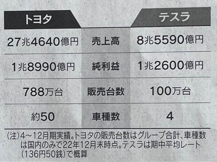 수익성이 도요타를 크게 웃도는 테슬라는 EV전문으로, 불과 4차동의 고급차만을 만들고 있는 전략이다.