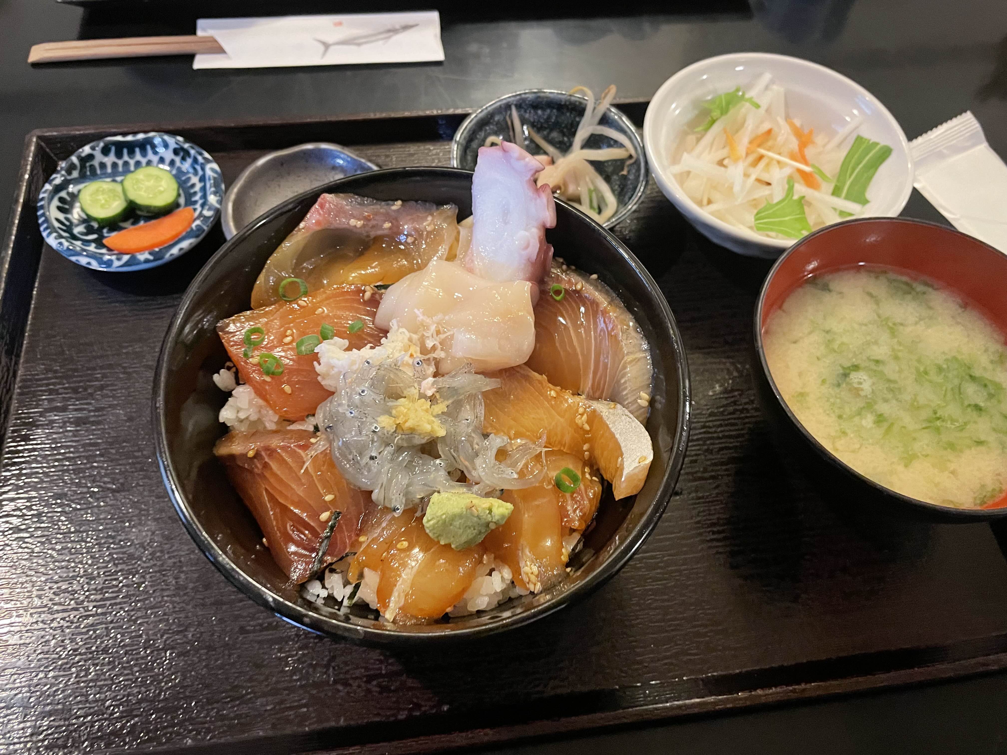 방어(ブリづけ)、잿방어(カンパチづけ)、농어(スズキづけ)、참돔(真鯛づけ)、생잔멸치(生シラス)、생가리비(生ホタテ)、문어(タコ)、바다참게(ズワイガニ)