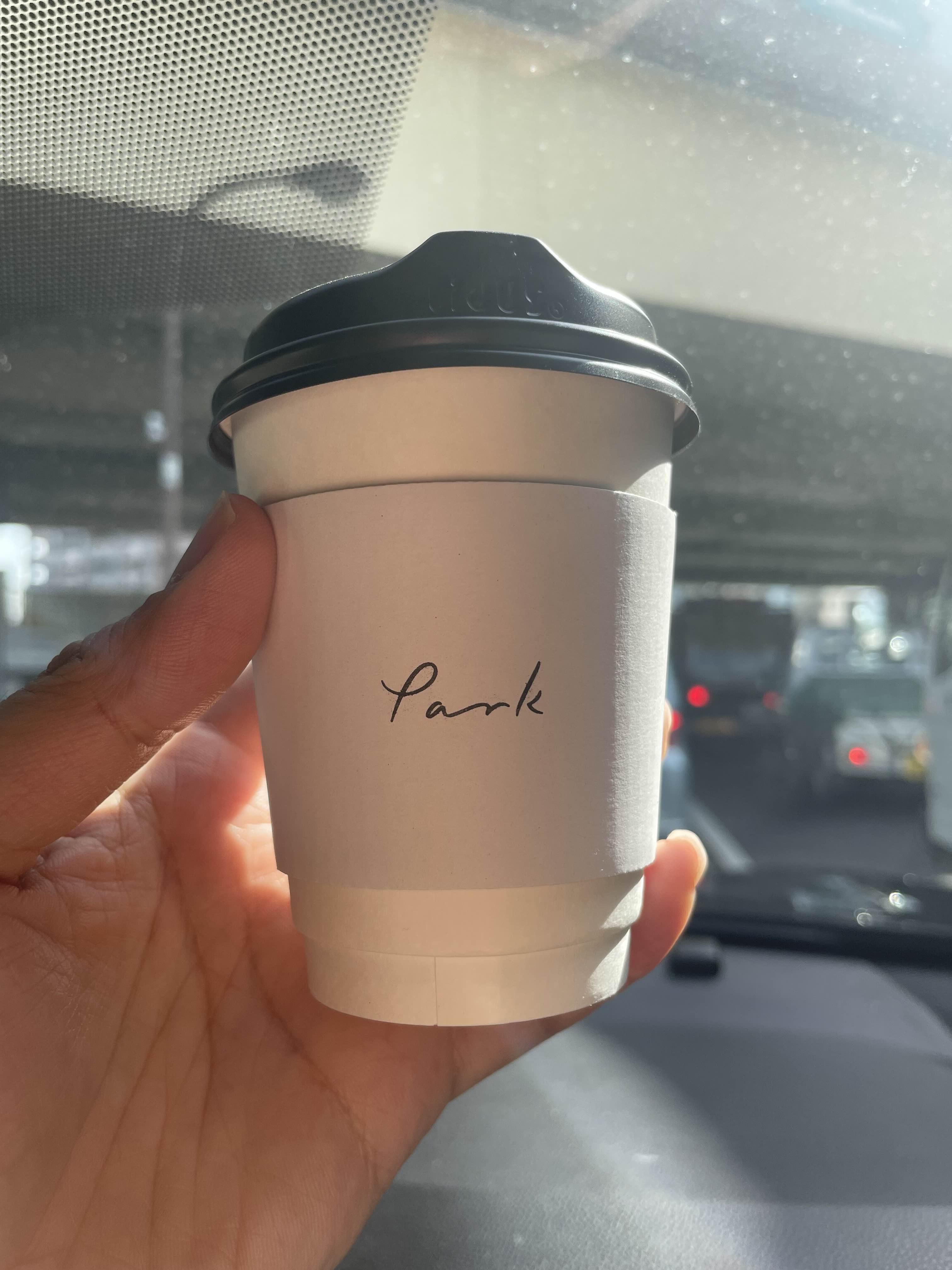 테이크아웃잔을 요청하니 저렇게 멋지게 park라고 적혀있는 컵을 주었다.