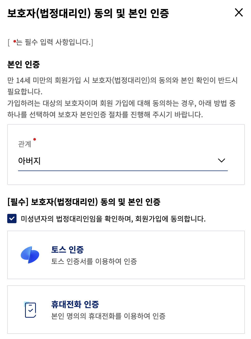 법정대리인 보호자 자격으로 보호자의 본인인증이 시작된다.
