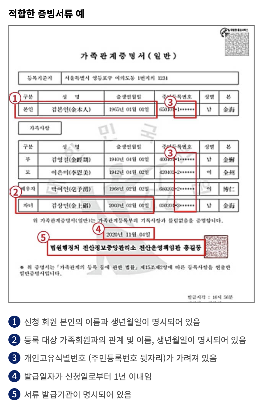 가족관계증명서는 신청자 본인(부모) 명의가 기자되어 있으며, 주민번호가 모두 가려져 있어야한다고 한다.