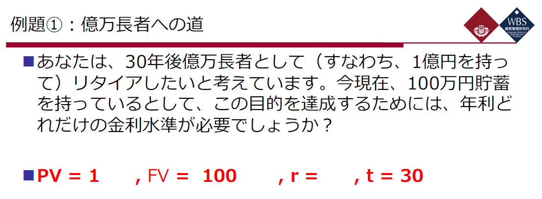 30년 뒤 1억엔 부자가 되기 위해서, 현재 100만엔을 보유하고 있다면, 금리는 몇 프로가 되어야하는가이다.