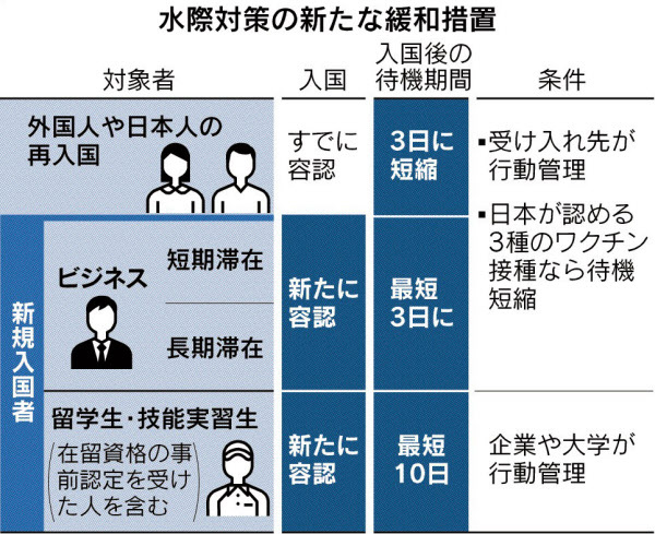 일본 정부는 사업 목적의 단기 체류자(비지니스), 유학생, 기능실습생의 신규 입국을 허용할 것이라고 한다.