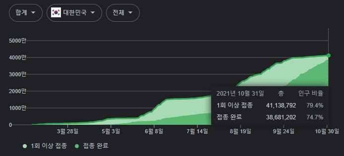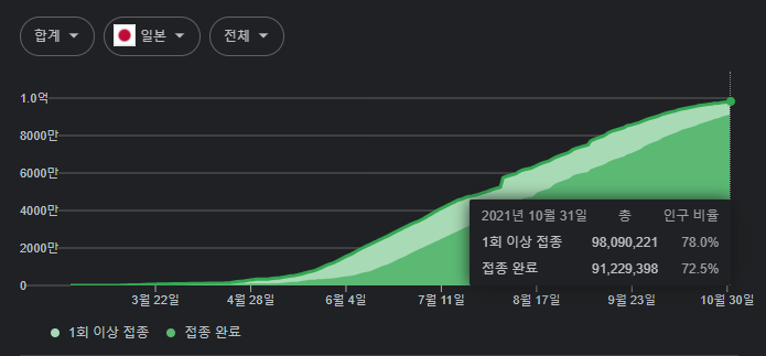 한국이 최근 1차 접종률 80%를 돌파한 것에 비하면 다소 일본의 접종률이 낮다.