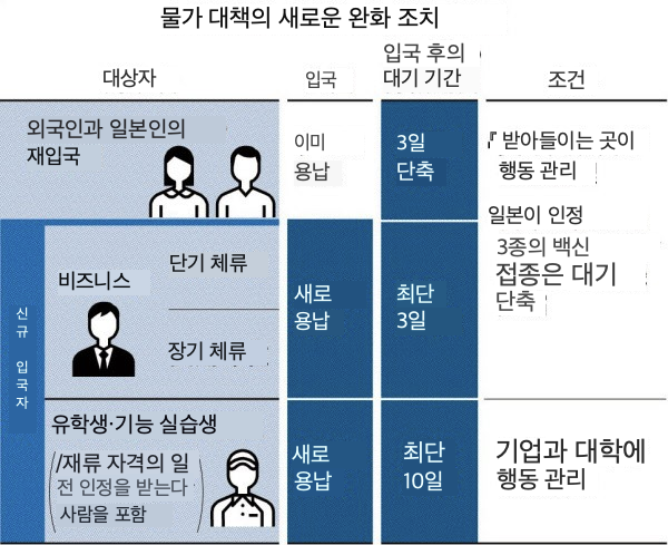 일본 정부는 사업 목적의 체류자(비지니스), 유학생, 기능실습생의 신규 입국을 허용할 것이라고 한다.