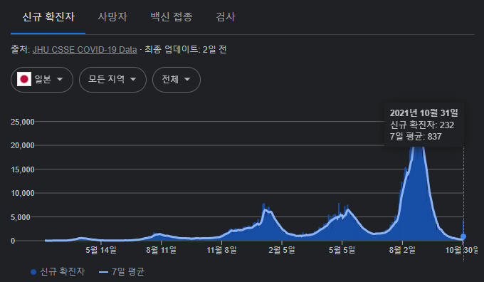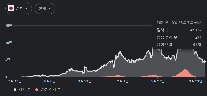 하지만 일본은 최근 몇 달간 접종 완료율이 높았던 것을 비교하면, 접종 완료율이 최근의 낮은 확진자 수와 연관이 있을 수도 있지 않을까 생각한다. (뇌피셜)
