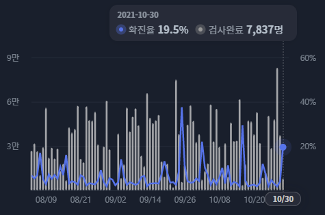 주말에 검사수가 감소하여 확진률이 20% 수준으로 폭등하기는 하나, 평균적으로 2~5% 정도의 확진률을 보이고 있다.
