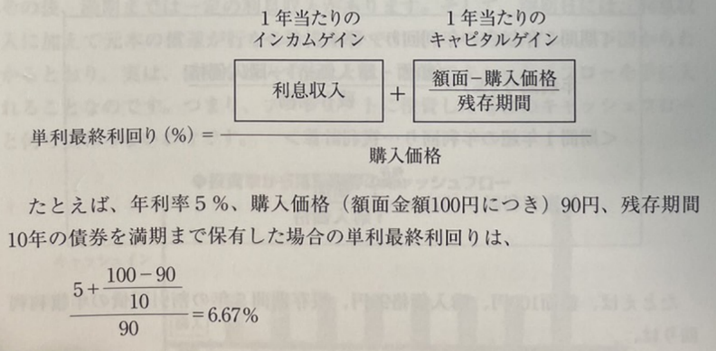 예를 들어, 연이율 5%, 구입가격 90엔, 잔존기간 10년의 채권을 만기까지 보유한 경우의 단리최종수익률은,