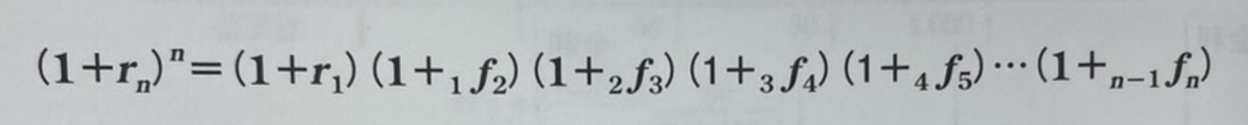 이런 전제가 성립되면, 앞선 식의 장기금리는, Spot Rate와 Forward Rate의 기하평균에 대등한 것을 알 수 있다.